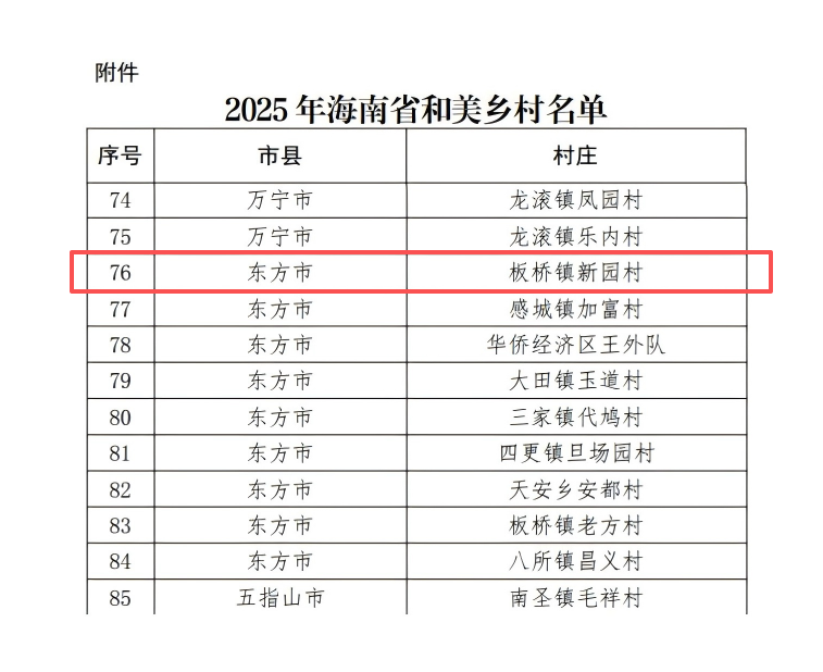 近日,海南省农业农村厅正式公布2025年海南省和美乡村名单,全省共200个行政村(社区、居)获此殊荣。其中,由伟德乡村振兴定点帮扶对象—东方市板桥镇新园村成功入选,标志着该村在宜居宜业、乡风文明、治理有效等方面取得显著成效,也彰显了校地协同推进乡村振兴的实践成果。