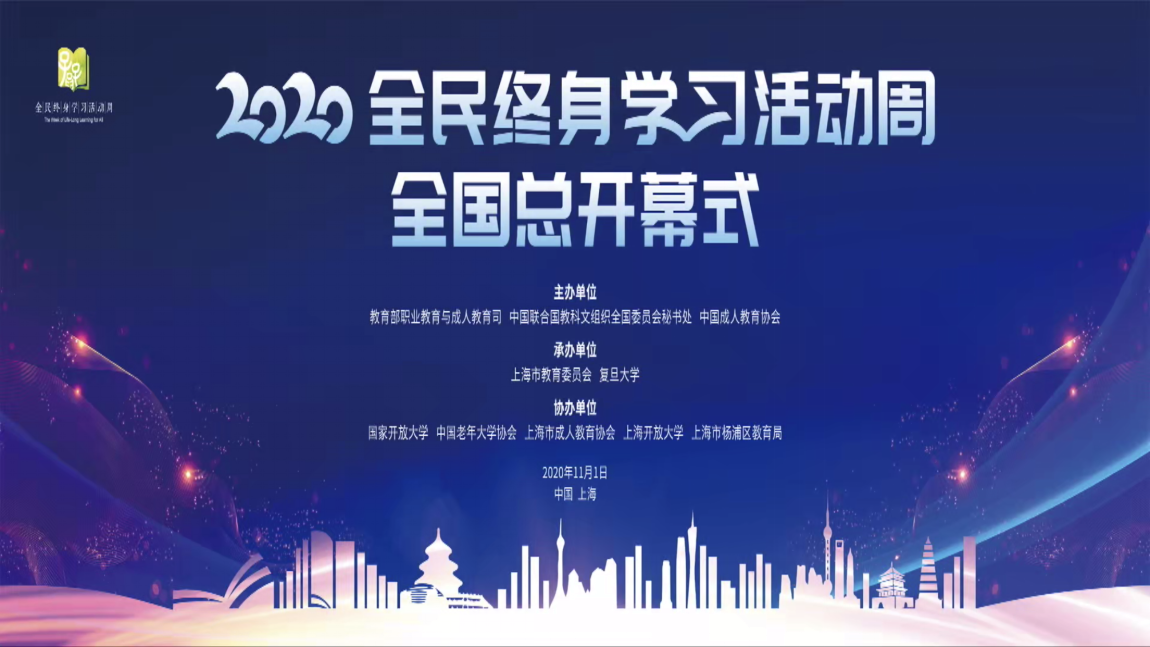 11月1日上午,2020年全国全民终身学习活动周总开幕式在上海市复旦大学主会场盛大开幕。今年的活动周以“全民智学,助力‘双战双赢’”为主题,线上线下同步开启。总开幕式在各省、自治区、直辖市教育厅(教委)设立了36个分会场,分管继续教育工作的负责人、相关处室负责人、分会场所在城市社区(老年)教育工作者、“百姓学习之星”“终身学习品牌项目”代表,共计1500余人参会。