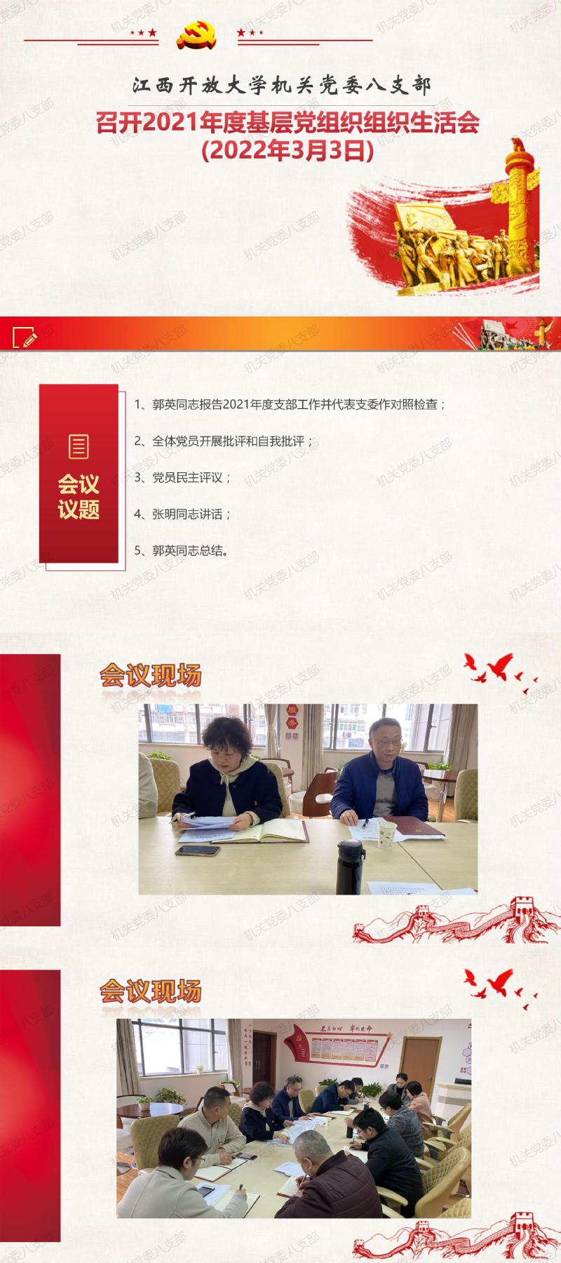 机关党委八支部3月3日召开2021年度基层党组织组织生活会和开展民主评议党员