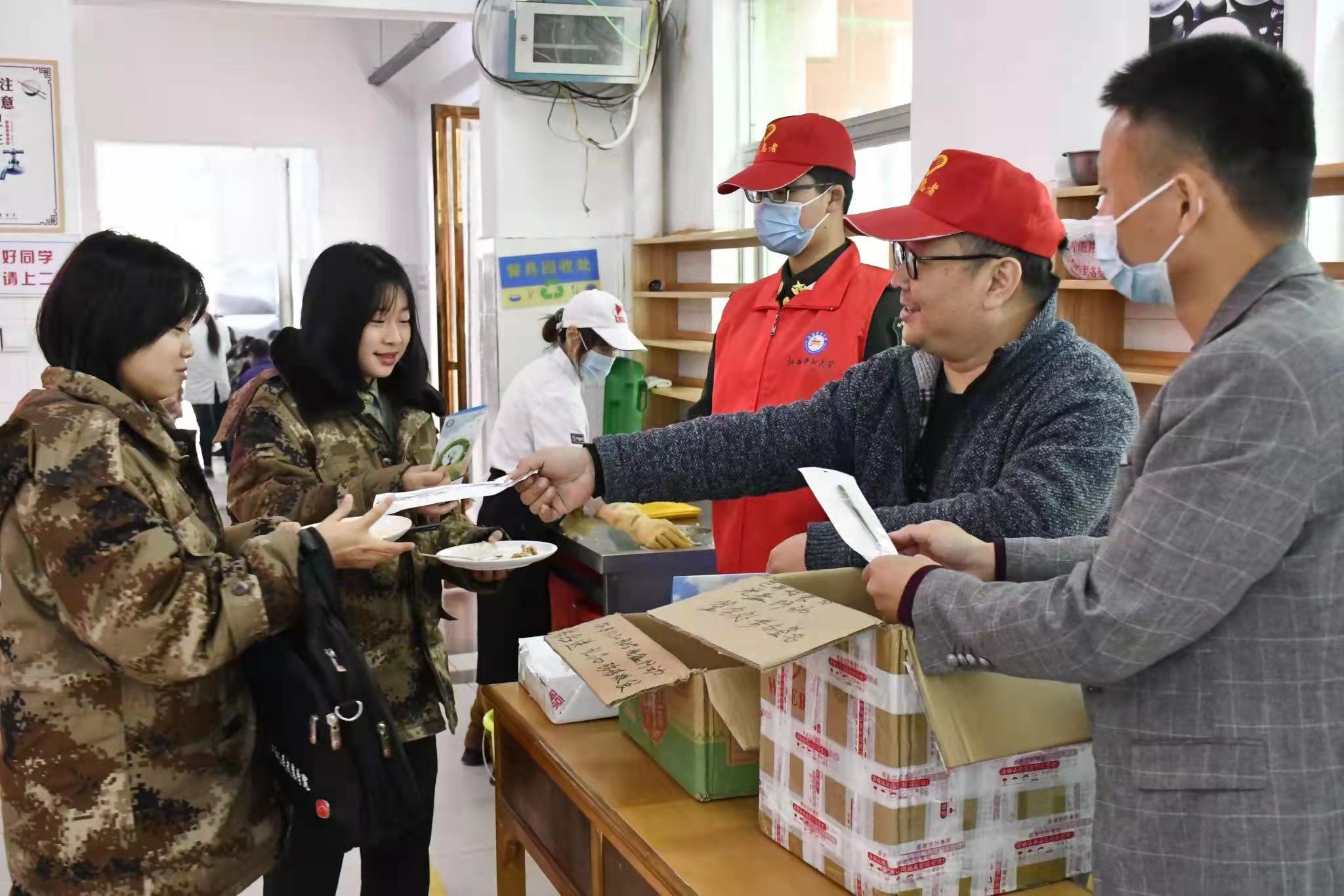 六、志愿者向来往的师生分发宣传册,向广大师生发出倡议和对践行“光盘”的师生分发纪念品